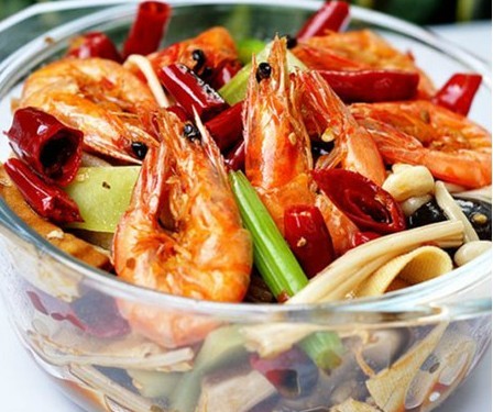 食材:300g海虾、100g五花肉、100g莴苣、100g藕、100g金针菇、100g豆皮、100g芹菜、适量油、适量盐、100g红干辣椒、适量花椒、适量香叶、适量桂皮、适量八角、适量茴香、10g白糖、5ml香油、适量香菇