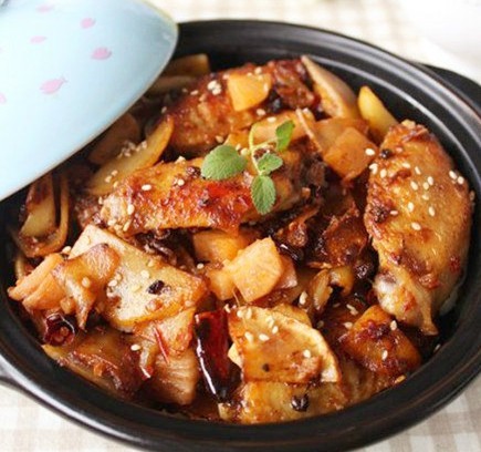 做法:1)鸡翅洗净,在背上化三刀,好入味。2)鸡翅碗里放小勺盐,葱末,姜末,白酒1小勺3)锅里不放油,把鸡皮的那面放锅底,小火慢慢煎出油。4)煎成金黄色再翻面,背面也煎成金黄色,此时锅里已经好多油渗出了。5)鸡翅盛出来,锅里焙出的油不用倒,直接放如切好片的土豆片翻炒成金黄色,有点点焦的感觉。6)锅里倒一点底油,放入花椒,小火慢慢烹出香味。7)放入干辣椒,蒜片,姜片,翻炒,再加入郫县豆瓣。8)倒入煎好的鸡翅翻炒入味。9)倒入炒好的土豆片,加糖。10)最后放入酸辣萝卜丁翻炒,出锅撒上白芝麻,花生碎即可。
