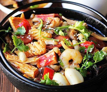 做法:1)木耳、腐竹事先用清水泡发,木耳清洗干净后去掉根蒂,撕成小块、腐竹切小段2)其他各种蔬菜清洗干净,该去皮的去皮,再改刀成块状或片状3)准备各种肉类,然后五花肉切片、葱姜切片、切丝备用,香肠切片,蟹柳切段4)准备各种调料,红辣椒和干辣椒切碎、豆瓣酱剁碎5)烧开一锅水,水中放一小勺盐,分别将各种蔬菜入锅焯熟,捞出后控干水分,将虾仁和鱿鱼片也一起焯熟6)锅中放两勺油(和平时炒菜差不多就好),油烧热后,将剁碎的豆瓣酱下锅煸炒,炒出红油7)放红辣椒和干辣椒(辣椒的量随自己喜好),放入五花肉炒熟8)加入葱姜蒜、洋葱、青椒片煸炒9)加入蟹柳、香肠和焯熟的鱿鱼卷和虾仁煸炒10)最后放入焯熟的各种蔬菜11)随个人口味加入半小勺盐、1小勺糖、1小勺辣椒油和少许花椒粉12)最后撒入烤熟的花生和白芝麻13)撒些孜然和香菜即可出锅