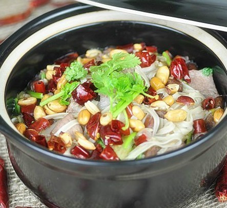 做法:1)辣椒切成小段。2)用漏勺将种子漏掉。3)平底锅烧热,转小火,倒油,放入辣椒,小心煸炒。4)花生炒香。5)芝麻炒香。6)猪肉切正方形丁。7)锅子烧热,倒油,放入葱,煸炒。8)放入猪肉丁,煸炒。9)倒入白糯米酒,煸炒。10)倒入一半辣椒。11)倒入一半花生米。12)倒入芝麻。13)煸炒。14)加入盐。15)煸炒至米酒挥发。16)砂锅烧开水,将炒好的肉丁倒入砂锅内。17)盖盖子,转中火,煮30分钟左右,熬制汤汁滋味浓郁。18)放入面条。19)将面条煮熟烂。20)关火,倒入香油。21)放入香菜。22)搅拌均匀,出锅即可。23)将剩余的一半花生去掉外皮,洒在面上,辣椒洒在面上,即可。