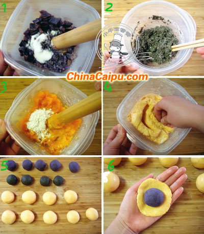 1、紫薯去皮蒸熟,加入适量糖、黄油乘热,捣烂搅拌成泥,为紫薯馅;