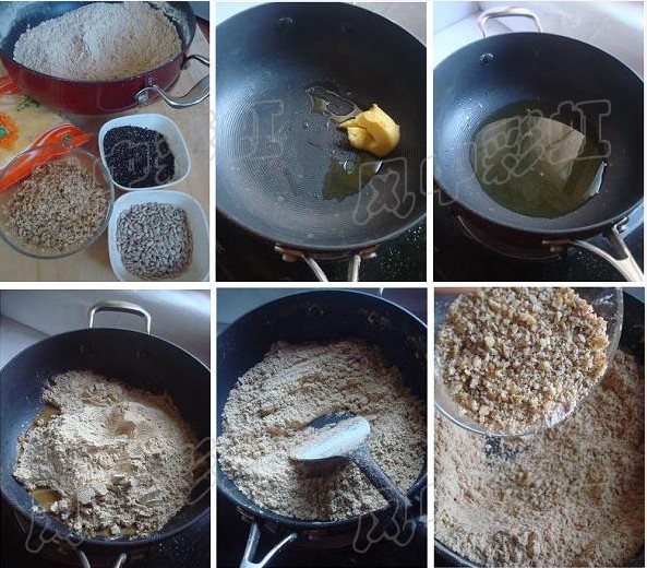 6、炒约30分钟,面粉的颜色已经变黄,而且会闻到熟面的香气