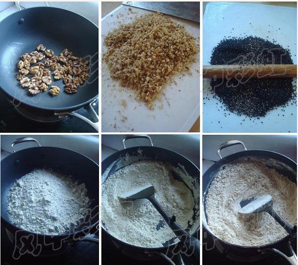 11、再将切碎的核桃仁、黑芝麻和瓜子仁倒入面粉中