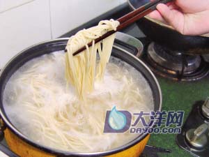 3 烧开锅内的水,加入1汤匙盐搅匀,放入拉面以大火煮沸,注入1碗清水再煮2分钟至沸腾,捞起过冷河,沥干水待用。