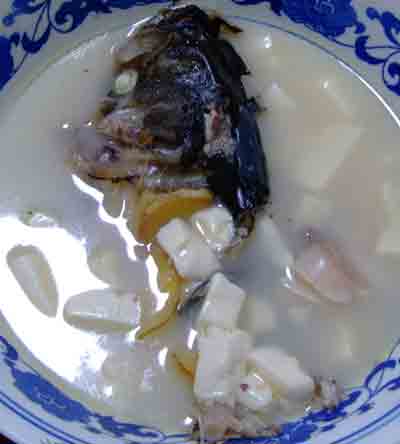 草鱼头豆腐汤原料:草鱼头1个,豆腐1块,节瓜1个,姜2片。调味料:盐1/2茶匙、胡椒粉少许。
