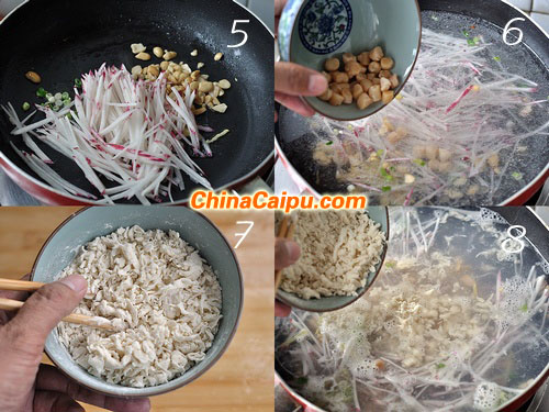 5、放入萝卜丝、花生碎翻炒。