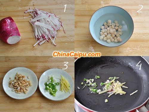 材料:萝卜、熟花生米、精盐、生姜、小葱、面粉、干贝(或海米等),油