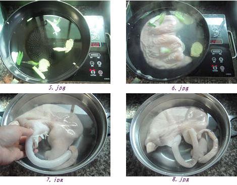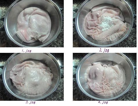 4:然后清洗干净,如此反复清洗三遍,直到猪肚上十分的清爽,无粘液为止。