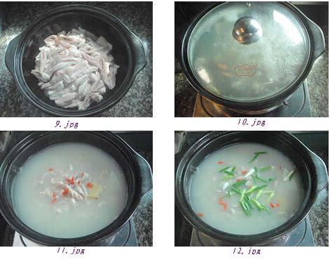 9:把猪肚切成小块,然后斜刀切成片放入用来煲汤的锅中。