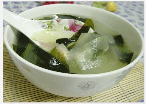 冬瓜海带汤的做法 原料: 冬瓜一块钱一斤,我买了2块钱的,海带也买了2块钱的,这个量已经够好几个人吃了。做法:1、将冬瓜去皮切块然后洗净。2、海带用水泡40分钟这样,我这种海带是打结好的海带,南京这里都有的卖。如果是那种大海带,回来泡好后切小块待用,我这种就不需要改刀了。3、锅中底油,油热倒入冬瓜和海带翻炒2分钟这样。4、为了多做点汤喝,所以把冬瓜海带倒入了另一个水开的蒸锅里。大火烧7,8分钟然后加盐就可以起锅了,咸淡自己要控制好。5、很简单的一道汤吧,夏天你应该要多吃吃冬瓜和海带的。