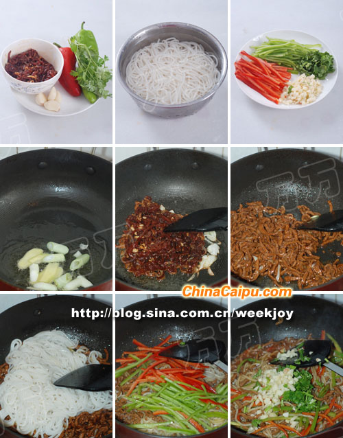 3.倒入沥去水分的米粉,与肉翻炒均匀,加入青红椒丝继续翻炒,出锅前加入蒜和香菜,可以根据口味再加入少许盐。