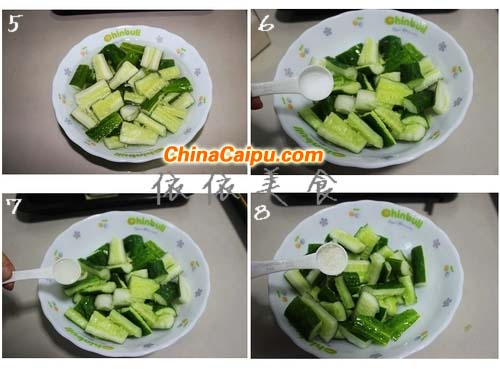 2、黄瓜清洗干净,撒上盐,用双手握住黄瓜搓擦两遍,冲洗干净;