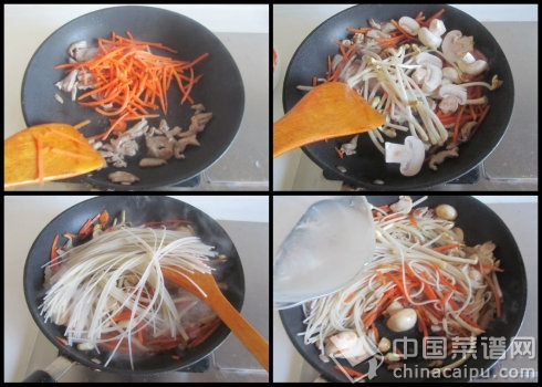 5. 肉丝煸炒变色后下入红萝卜丝翻炒;