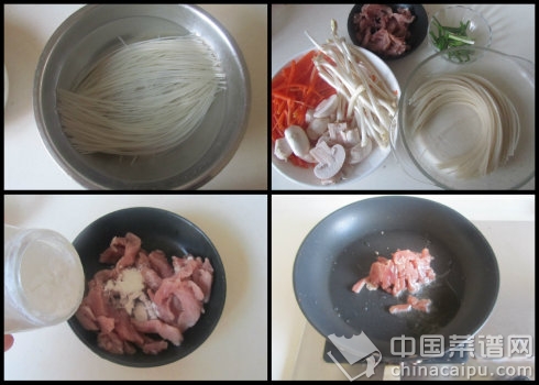 江西米粉 肉丝 口蘑 红萝卜 花生芽 小葱 料酒 淀粉 酱油 油盐