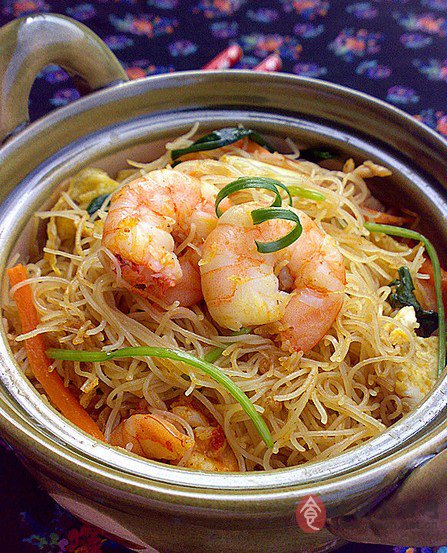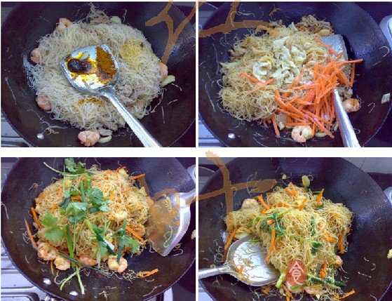 1鲜虾去壳,干米粉泡软,猪瘦肉切条状后用盐、糖、生粉腌好,红萝卜切丝、蛋打散,香菜、葱切段,蒜头切片