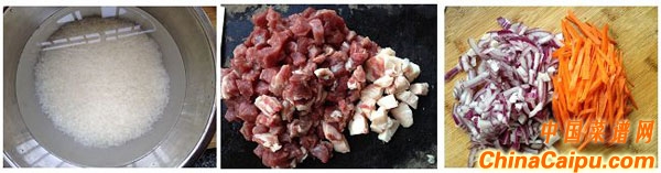 1、大米洗净浸泡约1小时,牛肉切粒,胡萝卜、洋葱切丝。还有葡萄干也给泡上。