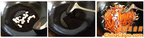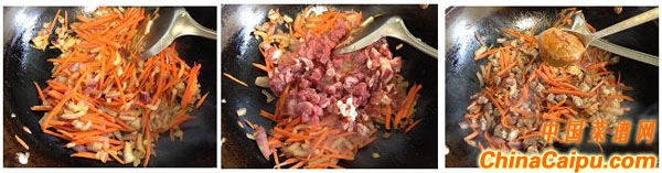 2、起锅坐油,先放牛肉的肥肉部分,小火熬出牛油后,油渣捞出不要,下胡萝卜和洋葱翻炒。