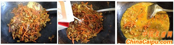 4、炒匀,加约100毫升牛奶,再加热水至完全没过所有食材煮开。
