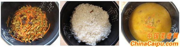 3、最后做饭的时候一定要注意水量,米是泡过的,而且蔬菜本身也会出水,所以加水量一定要比平时煮饭少。