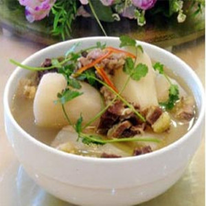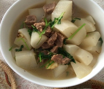 牛肉享有“肉中骄子”的美称。具有较高的蛋白质,脂肪含量低。氨基酸的组成胜过猪肉,与人类的各种氨基酸比例较一致,能提高身体抵抗能力;同时也含有矿物质和维生素B,牛肉还是我们身体需要的铁质的最佳来源哦。而白萝卜也是一种营养价值较高的蔬菜,含有丰富的维生素C和微量元素锌、芥子油 、淀粉酶和粗纤维。本草纲目称之为“蔬中最有利者”。所以说两者搭配在一起煮汤是绝对的天生一对。