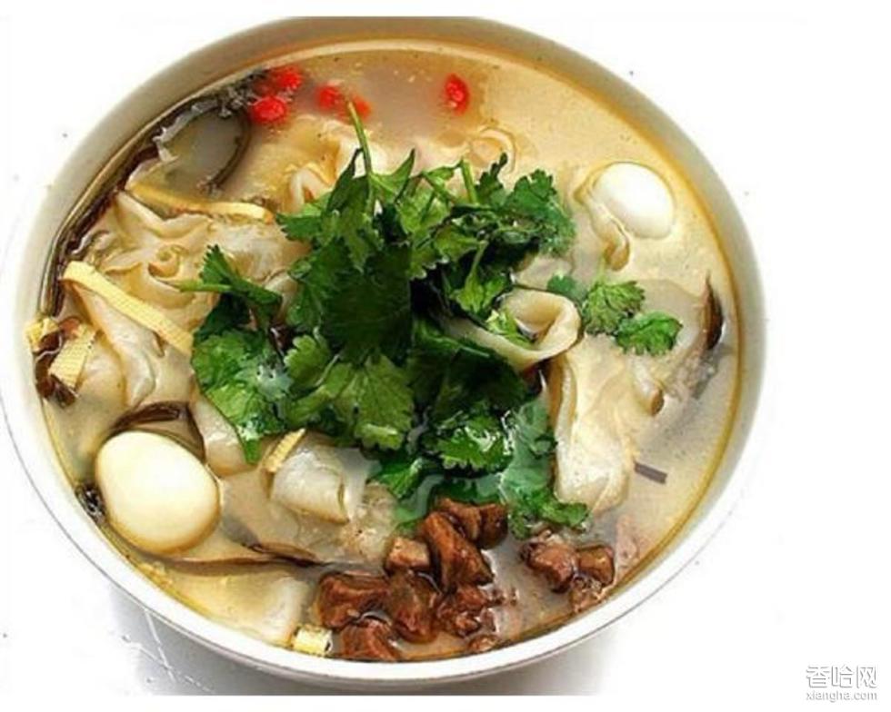 郑州没有发明什么,没有独立的菜系,合记烩面差不多是郑州的饮食标志。合记烩面宽有1*9.5公分,厚度如百合瓣,外滑内韧,咀嚼有张力,分为一段段地吃。吃去尺长,再喝汤。吃合记烩面,菜是一种多余的事物,面有富碱,和面之时,佐以鲜汤,羊肉烩面便佐羊肉汤,海鲜烩面便佐海鲜汤,以此类推。烩面也是以汤,羊肉烩面的羊肉汤里有羊肉若干,辅以粉丝、千张皮丝、海带丝、枸杞、香菜,辣椒是食者自己掌握投入,便是菜、面、汤具全了。