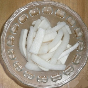 食材:白萝卜一颗、胡萝卜一颗、苹果和梨各半个、葱两根、辣椒面、生姜、鱼露。