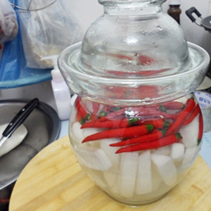 6、用盖子密封好,经过1个月时间,浸泡的萝卜好了,可以拿出来吃,味道很好。
