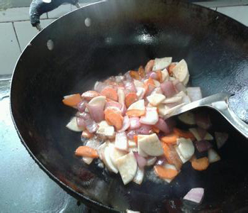 3 、炒锅放橄榄油加热,煸香姜丝后,洋葱入锅炒。