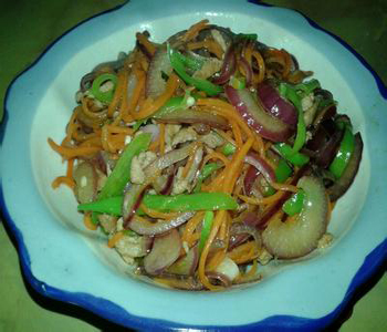 这是用洋葱、胡萝卜、肉片作食材素炒的一道菜。很清淡,很爽口。加之洋葱、胡萝卜都是蔬菜中的佳品,使得这道菜的营养很丰富,还有着养生保健功效。肉片具有丰富的动物蛋白,在日常生活中提供很大的热量。