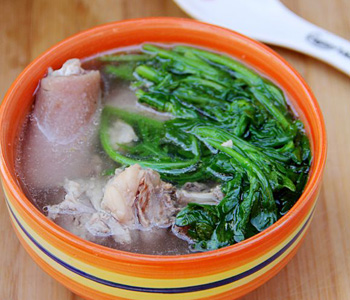 小贴士:猪骨冷水下锅焯去血水,这样炖的汤清凉没有血腥味,同时,茼蒿质嫩,下锅不易久煮。