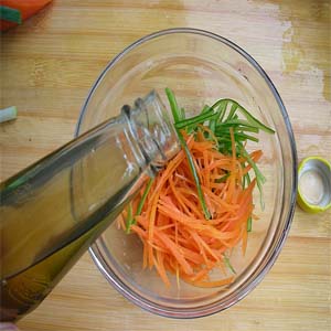 小贴士:胡萝卜用刀切丝,要切细点; 胡萝卜丝要先加上盐腌制一会,吃起来味道更好。