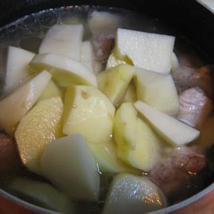 4、将排骨、葱姜、绍酒和适量清水,上旺火烧沸,再小火炖至半熟时,放土豆炖至熟烂,再加盐、味精起锅即可。