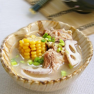 3、砂锅放清水,将排骨、姜、葱一起放入锅中,滴入少许料酒,煮开后,转小火煲约三十分钟,再放入玉米、莲藕一同煲制约一小时。