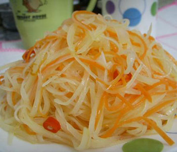 菜系及功效:私家菜 工艺:炒土豆胡萝卜片的制作材料:主料:土豆(黄皮)250克,胡萝卜100克