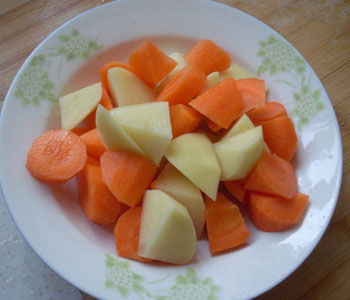 胡萝卜味甘,性平,有健脾和胃、补肝明目、清热解毒、壮阳补肾、透疹、降气止咳等功效。 富含维生素,并有轻微而持续发汗的作用,可刺激皮肤的新陈代谢,增进血液循环,从而使皮肤细嫩光滑,肤色红润,对美容健肤有独到的作用。而土豆[性能]味甘,性平。能补脾益气,缓急止痛,通利大便。 含蛋白质、糖、脂肪、胡萝卜素,维生素B1、B2、C,无机盐(以钾盐为多)、少量龙葵碱等。