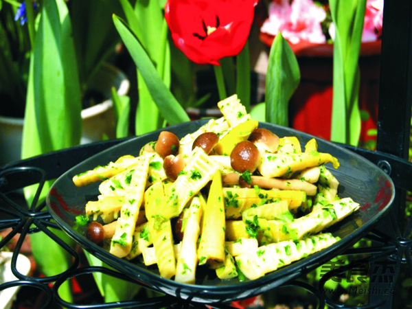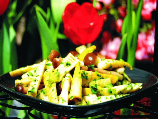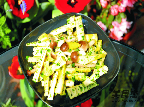1.春笋剥掉外壳和老根,洗净切成条,荠菜清洗干净去掉老根斩成末,蟹味菇去根洗净