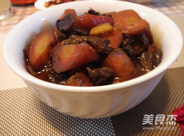 红萝卜甜甜甜,看到看到就过年。 主料 胡萝卜300克 牛腩600克 辅料 菜籽油3勺 盐5克 姜1块 五香粉2克 辣椒(红,尖,干)3个 花椒10粒 生抽5克 老抽2克 胡萝卜烧牛肉的做法 1.炒锅放油,放焯过水的牛腩块炒干水分 2.放姜,辣椒段,花椒粒炒 3.放生抽 4.老抽 5.加两大碗清水烧 6.胡萝卜功滚刀块 7.牛肉炖至60分钟时加萝卜块 8.再烧20分钟 9.水汁收快干时,放盐,五香粉,炒匀关火。 烹饪技巧 牛腩一定要炖得软烂才好吃,可以用压力锅压更方便快捷。