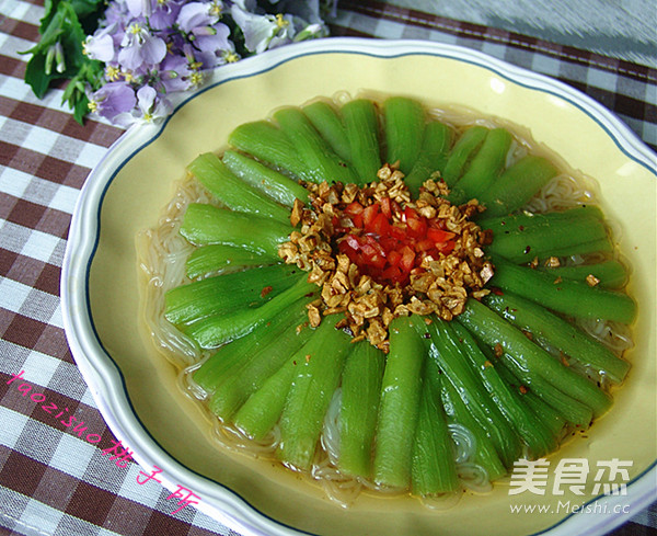 8.将炒好的金蒜浇在蒸好的丝瓜上,撒上少许红椒碎装饰即可。