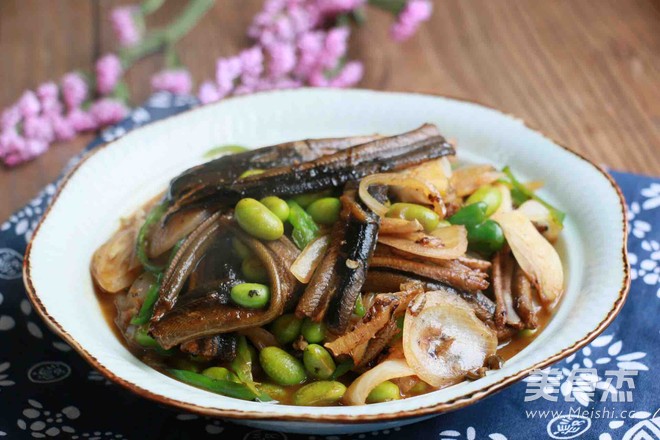 4.倒料酒,老抽,白糖,醋将鳝鱼丝翻炒均匀后放入毛豆籽,继续翻炒上色。