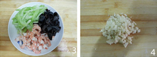 2、虾去皮,去虾线,虾仁焯水使虾体卷曲,颜色变红,虾熟即可。