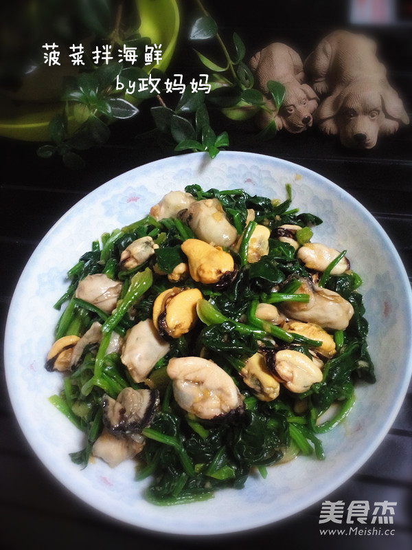 家常凉拌菜,菠菜与海虹,海蛎子,毛蛤蜊等小海鲜拌在一起,味道都很好吃,做法也很简单。 主料 菠菜250克 海蛎子100克 海虹100克 辅料 醋1勺 味极鲜酱油1勺 蚝油1勺 蒜泥适量 菠菜拌海鲜的做法 1.菠菜摘洗干净,切段。 2.将菠菜入锅焯水后用凉开水冲凉后,捞出适当挤干水分。 3.海蛎肉,海虹肉焯水,焯熟后取出沥干水分。 4.将菠菜,海鲜肉放入盆中,加入味极鲜酱油。 5.加入蚝油。 6.加入醋拌匀即可。 烹饪技巧 还可以加入一点香油,或者辣椒油拌匀,也很好吃。