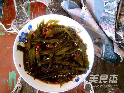 酸酸辣辣很开胃! 主料 海带1盘 辅料 辣椒碎1茶匙 鸡精1.5小勺 盐2小勺 醋1茶匙 酱油3茶匙 凉拌海带的做法 1.海带洗净,切丝,浸泡一会儿,用水焯6分钟,捞出到盘子中 2.准备1茶匙辣椒碎 3.加入2小勺盐,1.5小勺鸡精 4.倒入3茶匙酱油,搅匀 5.准备1茶匙的醋 6.将调味汁倒在海带丝上,拌匀,即可 烹饪技巧 如喜辣,可多加些辣椒碎