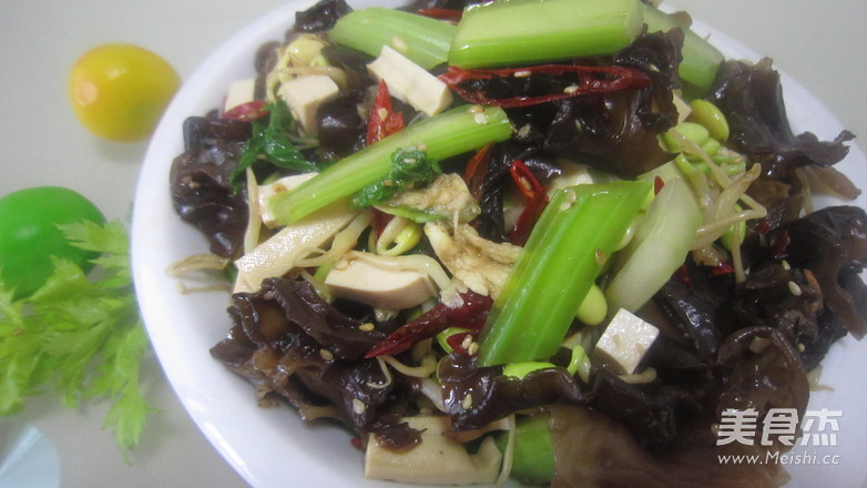把豆芽开水焯一下,豆干切小条状,木耳也要开水焯一下,全部放一盆中,放入干辣椒丝 熟芝麻 盐 用热油泼到辣子丝上,倒入生抽米醋搅拌 就好了快手菜也好吃.