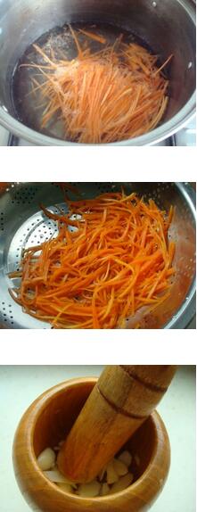 凉拌粉丝的材料:干粉丝,胡萝卜,红油 大蒜 生抽 米醋 盐 白糖 鸡精 凉拌粉丝的做法: 1.粉丝入沸水锅中焯熟泡软捞出过凉沥干水分,胡萝卜切成丝,越细越好,锅里焯一下,捞出,过凉沥干水分,大蒜去皮,捣成蒜泥 学做菜 的做法 2.用大蒜泥,白糖米醋盐 鸡精 调成汁 3.把粉丝和胡萝卜丝装在大碗里,加入调好的汁,拌均匀再加红油拌均匀就好了