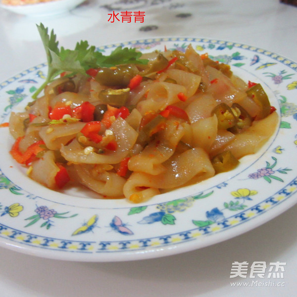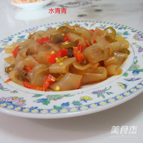 酸辣椒拌玉米粉皮,也就是粉皮是用玉米淀粉做的,自已在家试做的粉皮哦。正棕健康食物。 主料 酸辣椒3个 红辣椒半个 粉皮200克 辅料 蚝油半匙 生抽5克 辣椒油1勺 调味鲜2克 酸辣椒拌玉米粉皮的做法 1.刚用玉米淀粉做的粉皮 2.备酸辣椒,红辣椒 3.辣椒切碎,粉皮少许切块 4.碗里倒进辣椒油,撒上香葱,调味鲜,淋上生抽,蚝油合成汁 5.倒在粉皮碗里 6.拌匀置十分钟入味 7.即成 烹饪技巧 酸辣椒和辣椒先用油炒香也行