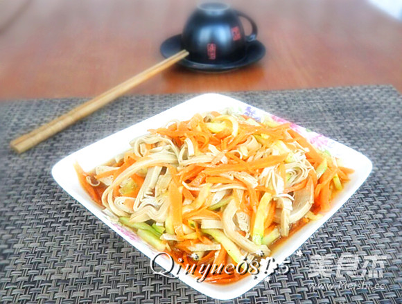 一款简单小菜 主料 豆皮120克 黄瓜100克 胡萝卜100克 辅料 芥末沙拉2勺 盐1/3勺 胡椒粉1/4勺 辣椒油1勺 拌三丝的做法 1.准备食材 2.把豆腐皮、黄瓜切丝 3.胡萝卜切丝焯一下 4.凉水浸一下胡萝卜丝,控水。 5.把所有食材放容器调入芥末沙拉 6.调入盐、胡椒粉、辣椒油即可。 烹饪技巧 根据自己口味放调料