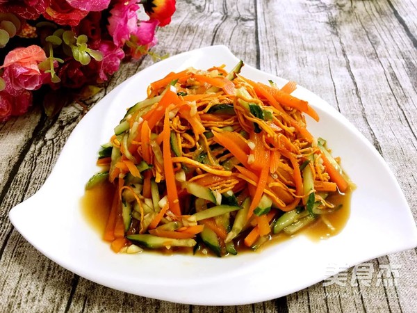 5.把黄瓜丝放入,再把生抽、醋、香油、盐的料汁倒入搅拌均匀即可。