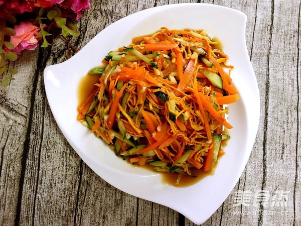 1.将虫草花用水洗净、用温水浸透。 黄瓜和胡萝卜切丝。大蒜切碎末。