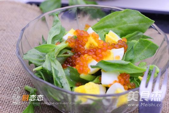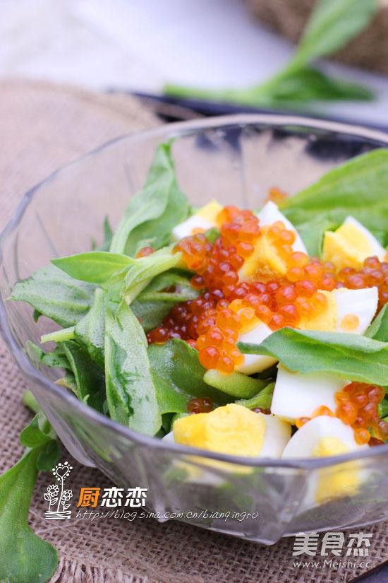4.把切好的鸡蛋块和一勺鱼子酱放到冰菜上