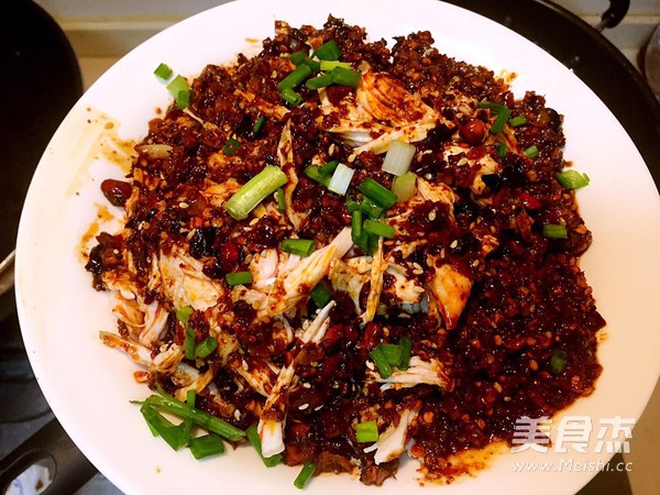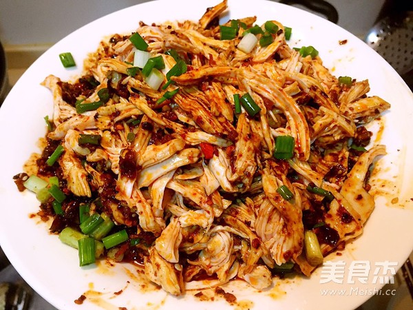 5.按照纹路撕成鸡丝,调料倒入,撒一点葱花,完成
